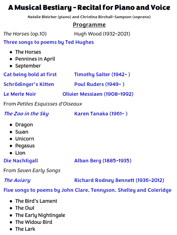 A Musical Bestiary – Recital for Piano & Voice – Natalie Bleicher (piano) and Christina Birchall -Sampson (soprano)