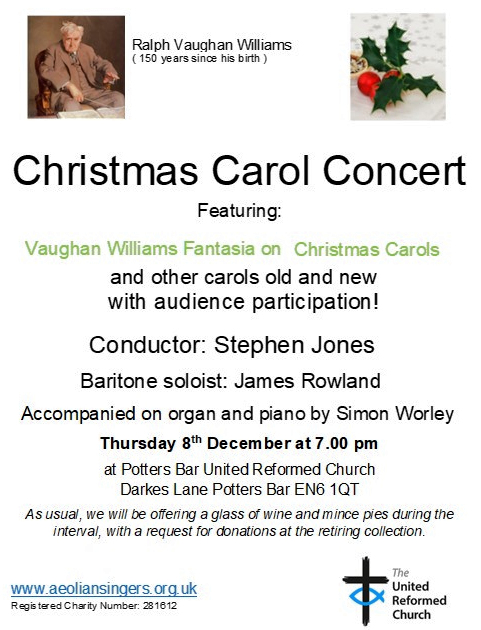 What a pleasure to have the Aeolian Singers at Potters Bar URC to perform their Christmas Concert. It was a ‘first’ for us, and they came with an extensive programme of carols, two readings and other choral pieces. It being the 150th anniversary of Vaughan Williams the second piece was his Fantasia on Christmas Carols with James Rowland the lead Baritone.