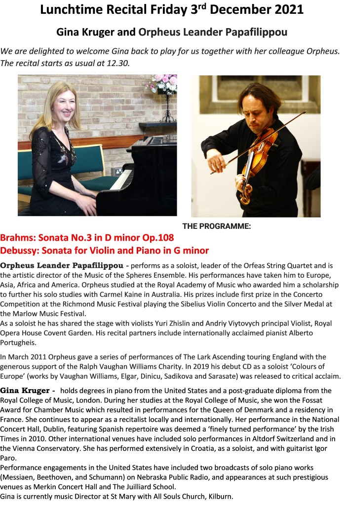 It was great to have Gina Kruger back with us in person (another very welcomed Zoom Recital performer last year!) and this time she brough the violinist Orpheus Papafilippou to play us violin Sonatas from Debussy and Brahms. It’s the first time we have had a solo violinist play in for us in a recital, and it was a real joy to watch and to listen.